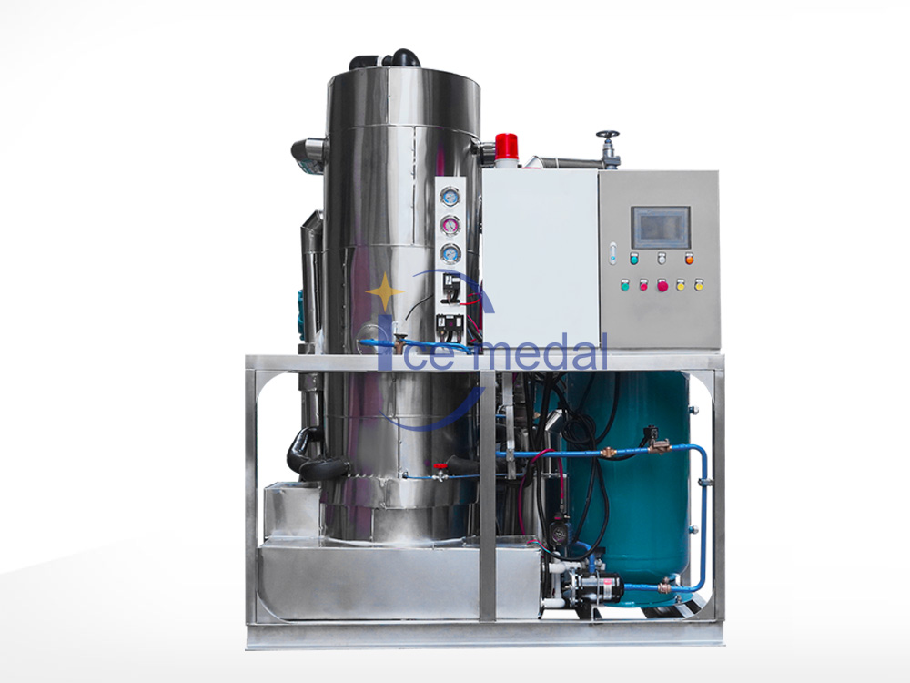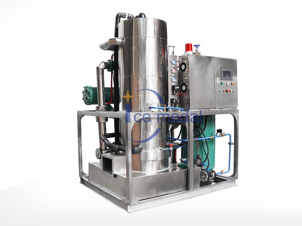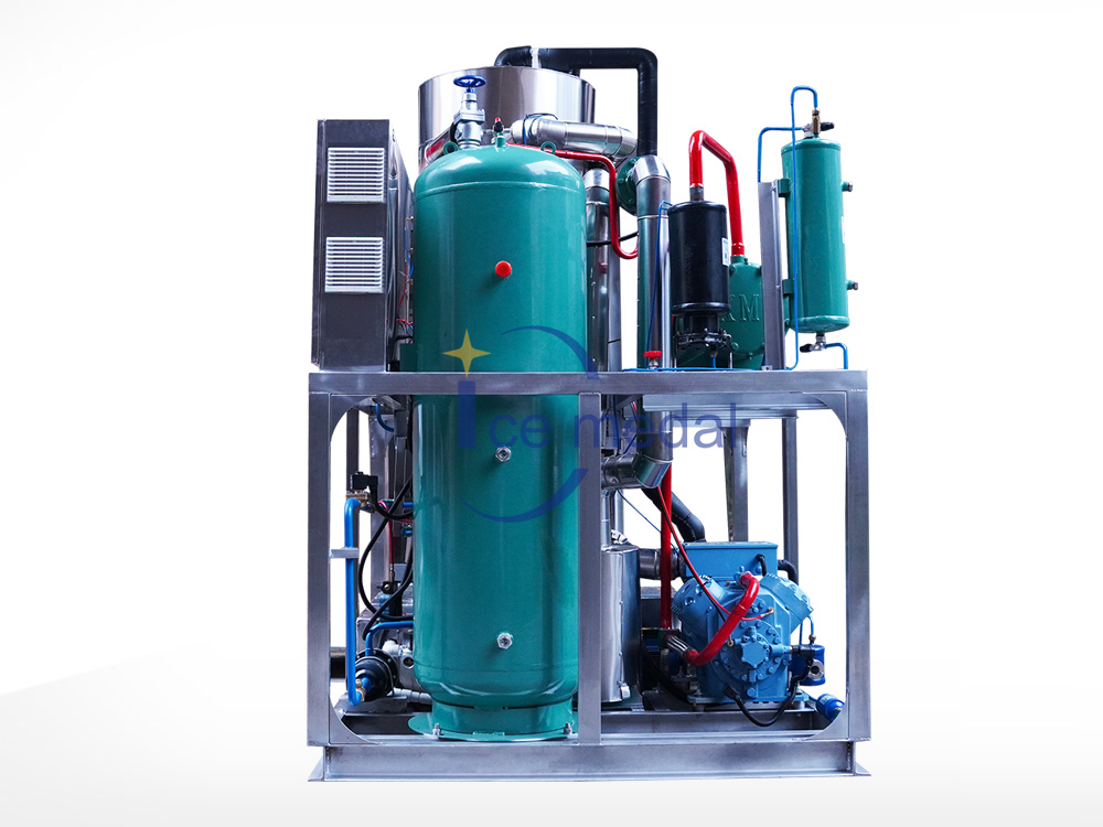 2、管冰機所有與制冰水接觸部分材質(zhì)均是食用級材料。 由多根不銹鋼管組成蒸發(fā)器制冷劑在管與管之間流動,水在管內(nèi)從上往下在分水器的作用下呈螺旋狀流動, 水在流動過程中形成冰。